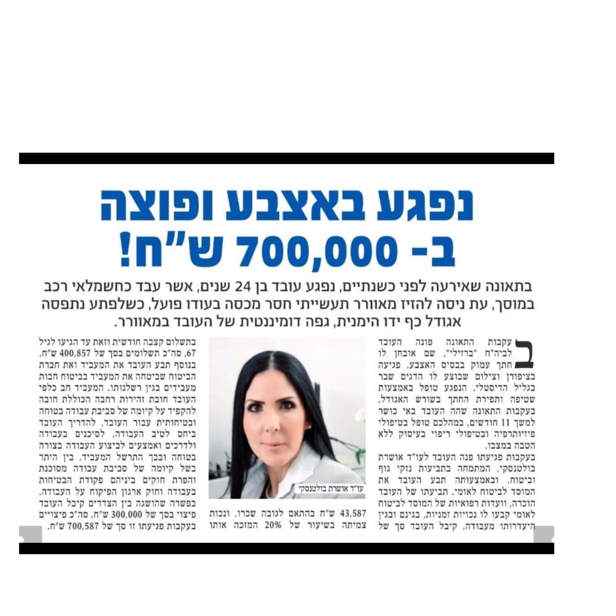 משרד עו״ד אושרת בולטנסקי מעניק לכל נפגע גוף ליווי אישי, צמוד ומקיף – החל מפגישת הייעוץ הראשונית ועד לסיום ההליך בקבלת הפיצויים המגיעים לו. שכר הטרחה בתחום נזקי הגוף והביטוח מבוסס על הצלחה בפועל בלבד, ומשולם כאחוז מהפיצוי או התגמולים המתקבלים בסיום ההליך.