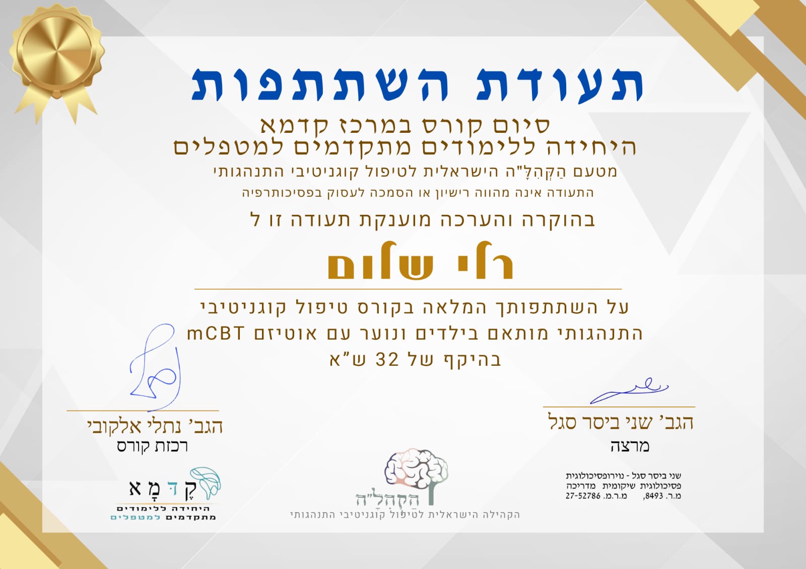 שמי רלי שלום, פסיכותרפיסטית בגישת הטיפול הקוגניטיבית־התנהגותית (CBT), מטפלת בגישת NLP, יועצת חינוכית ומדריכת הורים.